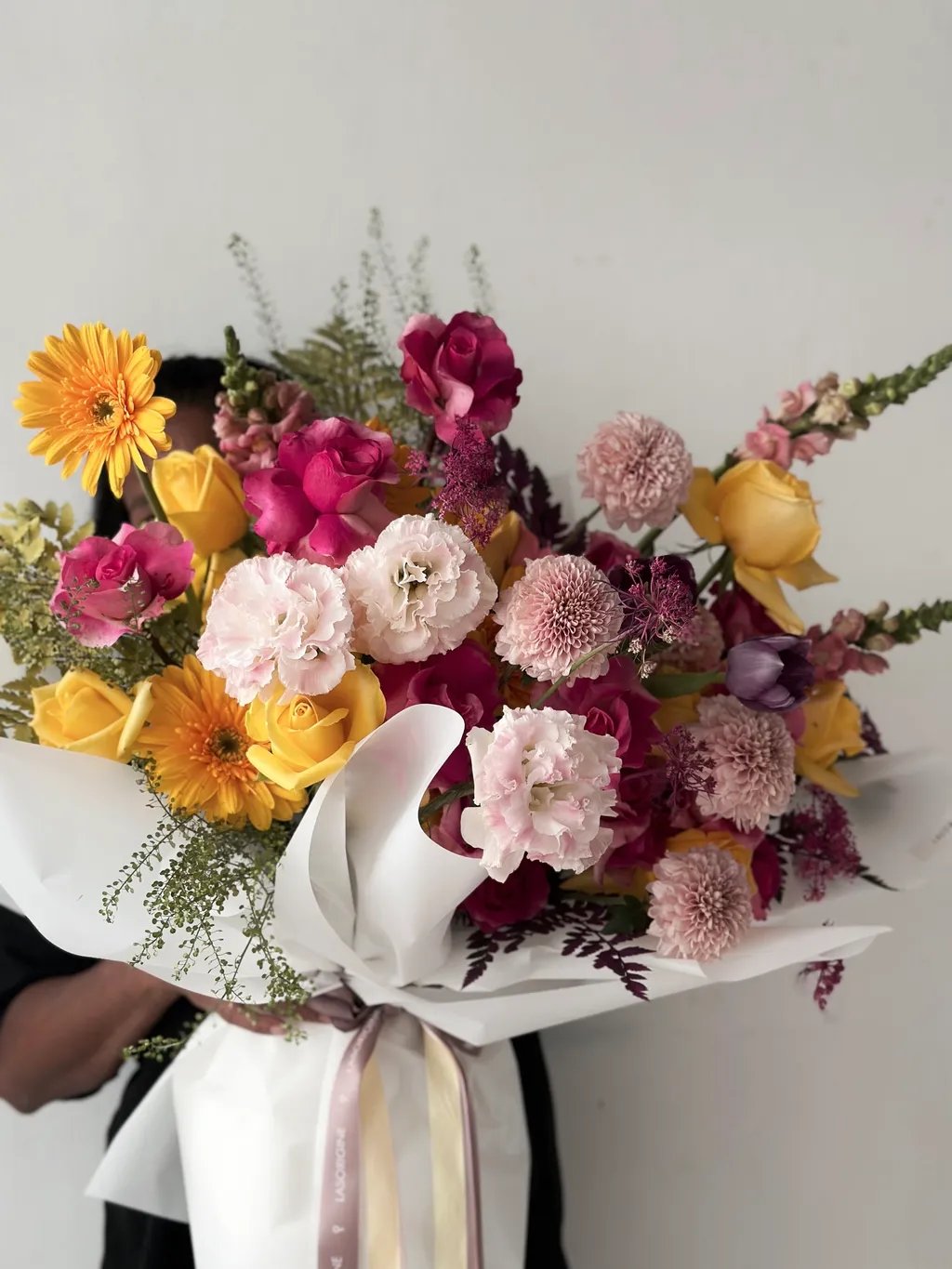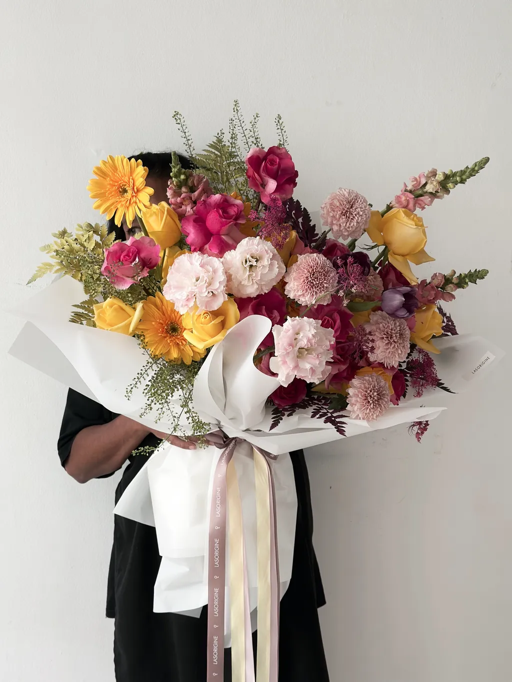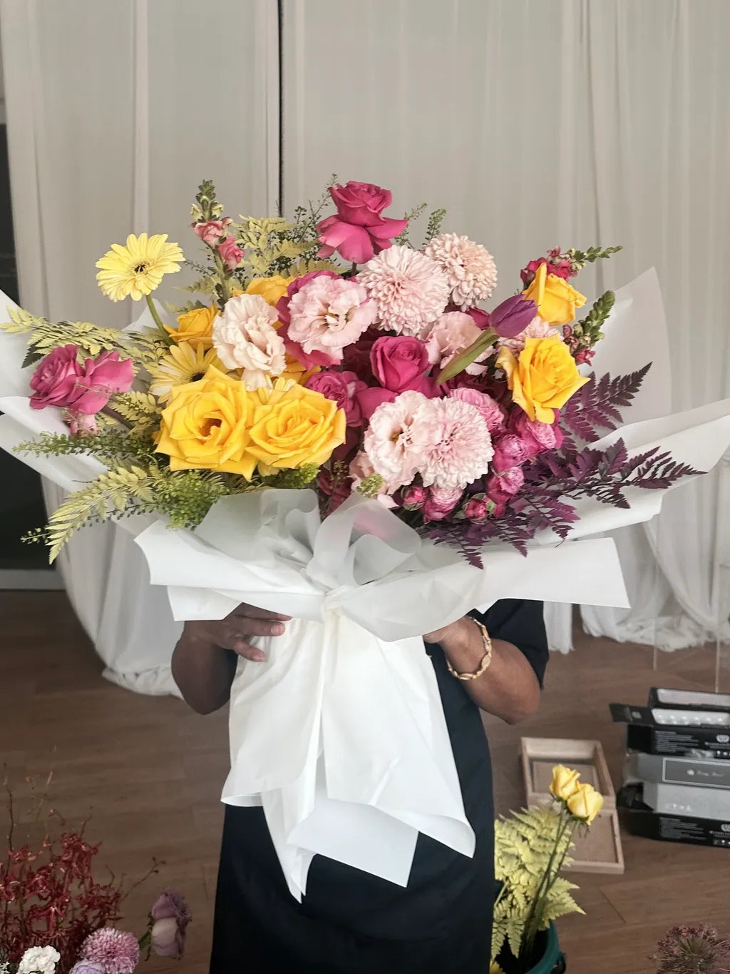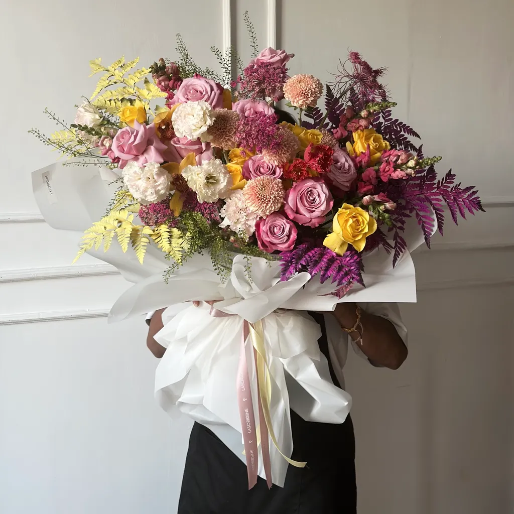 Due to its nature, bloom of the flowers may also differ depending on season and supply. In the event of any supply difficulties, we reserve the right to substitute with a product of equivalent value and quality without prior notice. Please do not expect to receive 100% same arrangement as the sample photo.